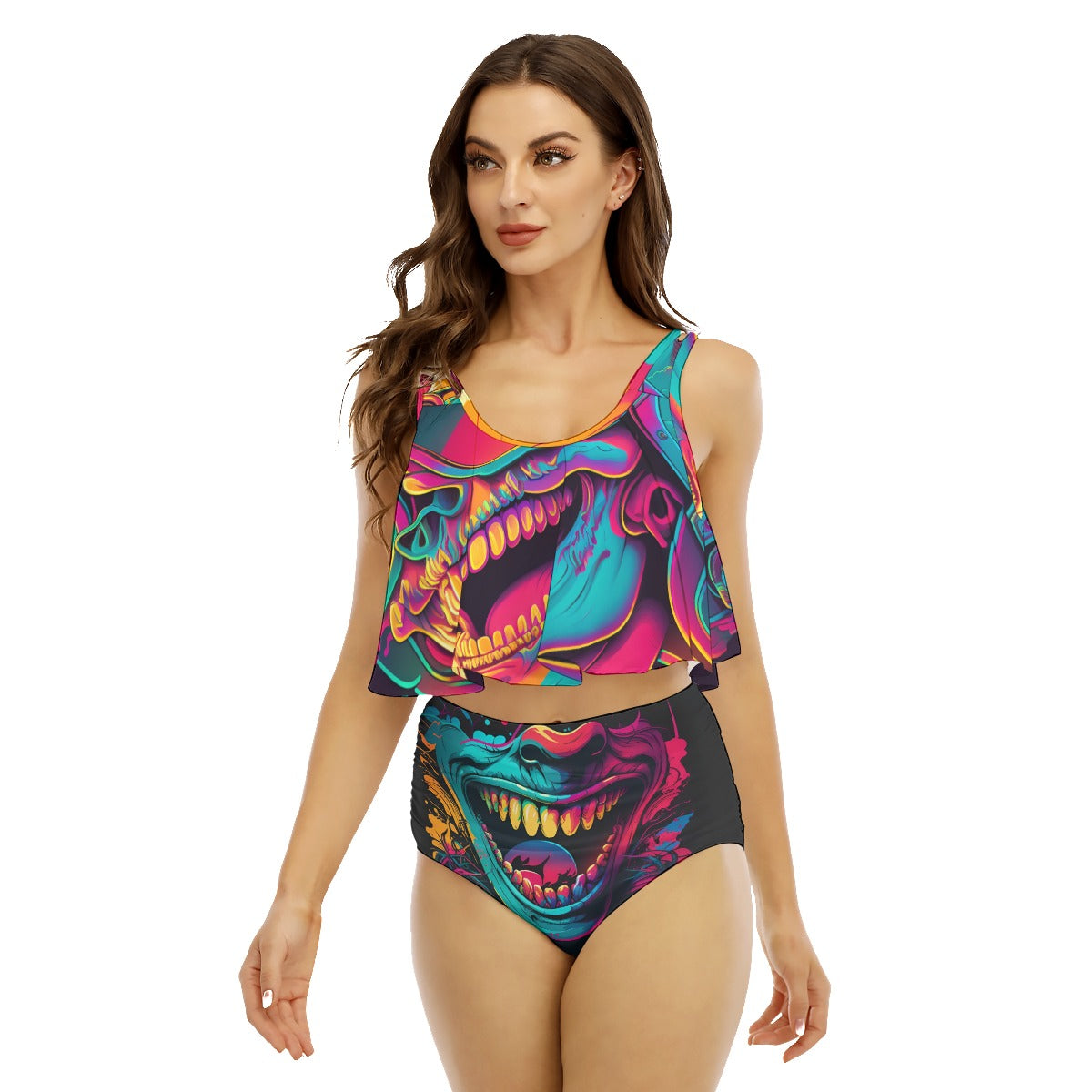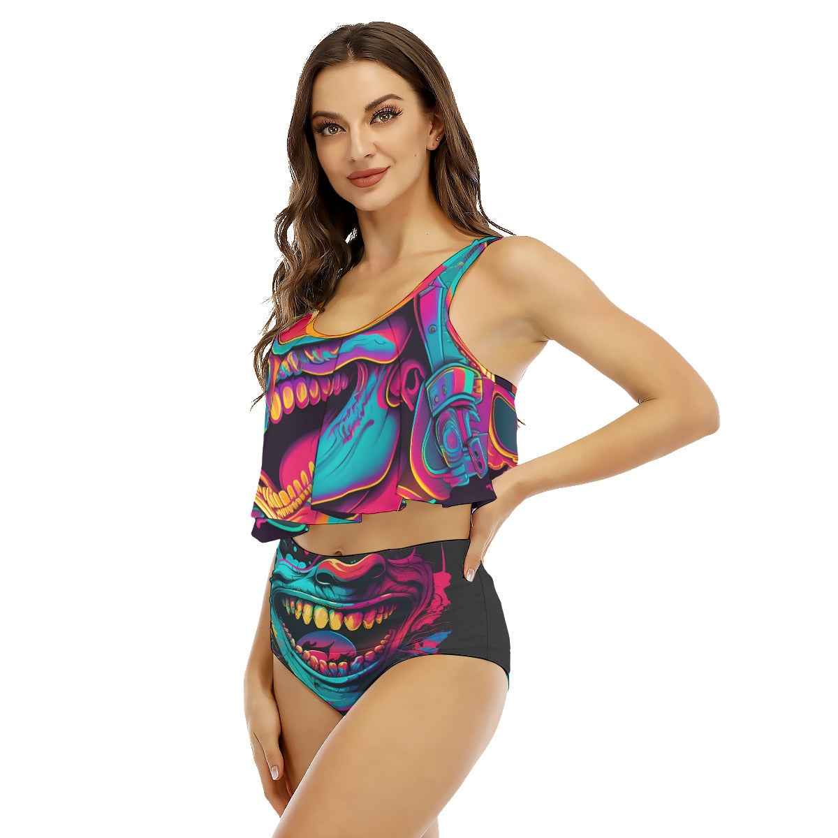 Sexy two-piece bikini with ruffles on the top, suspender top, and lining at the bottom